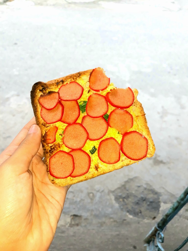 Bread with cheese and hotdog/onion.